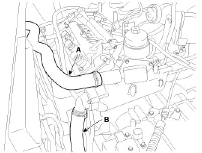 7. Remove the radiator upper hose (A) and lower hose (B).