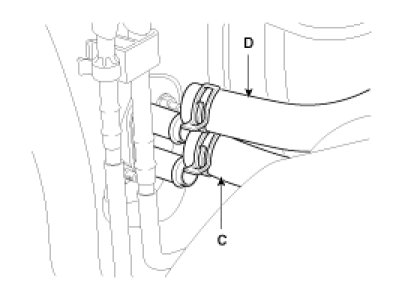 5. Disconnect the inlet (C) and outlet (D) heater hoses from the heater unit.