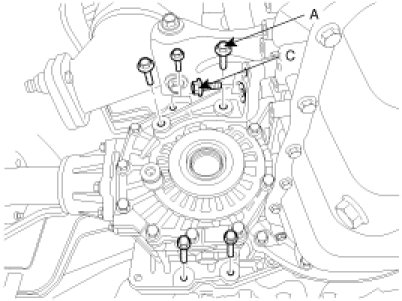 6. Remove up and down mounting bolt (A, B) after removing the transfer case bracket mounting bolt (C).