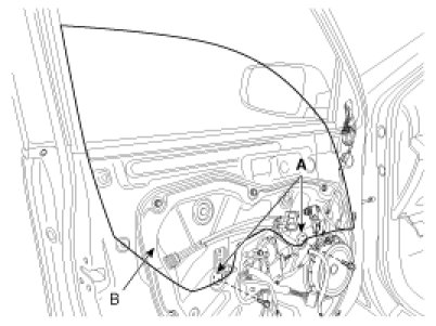 3. Carefully adjust the glass (B) until you can see the bolts, then loosen them. Separate the glass from the glass run and carefully pull the glass out through the window slot.