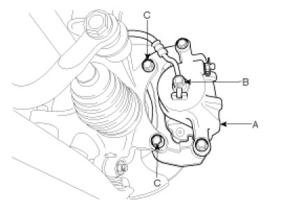 2. Loosen the hose eye-bolt (B) and caliper mounting bolts (C), then remove the front caliper assembly (A).