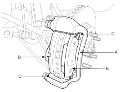 3. Replace pad shim (B), pad retainers (C) and brake pads (B) in the caliper bracket (A).