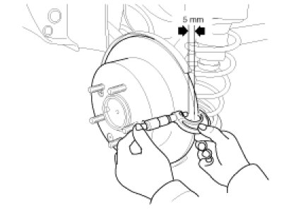 1. Place a dial gauge about 5mm (0.2 in.) from the outer circumference of the brake disc, and measure the runout of the disc.
