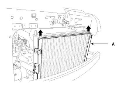 6. Remove the condenser (A) by lifting it up. Be careful not to damage the radiator and condenser fins when removing the condenser.