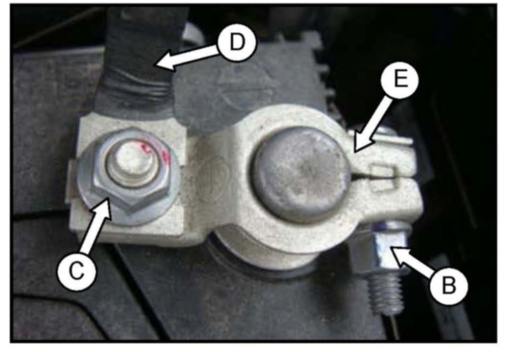 3. Repeat step 2 for the Positive (+) battery cable terminal (F) side.