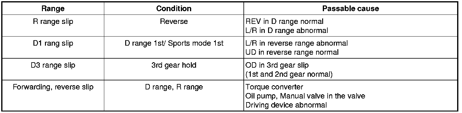 This test measures the maximum engine speed when the select lever is at the "D" or "R" position and the torque converter stalls. This tests the operation of the torque converter, starter motor and one-way clutch operation and the holding performance of the clutches and brakes in the transmission.