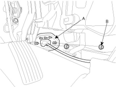 7. Remove the shift lock cable mounting nut (B).