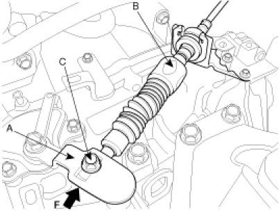 2. Push the shift cable (B) lightly to "F" direction shown to eliminate the free play.