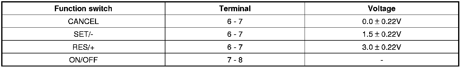 2. Measure voltage between terminals on the harness side connector when each function switch is ON (switch is depressed).
