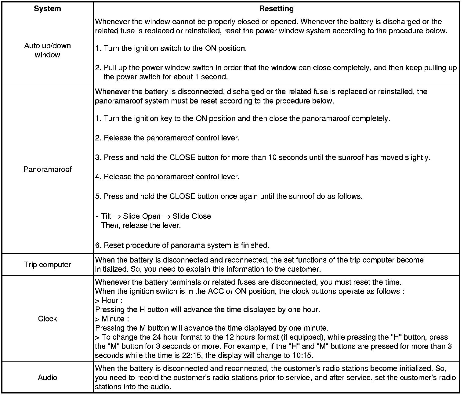 When reconnecting the battery cable after disconnecting, recharging battery after discharged or installing the memory fuse located on the driver's side panel after removing, be sure to reset systems mentioned on the below table.