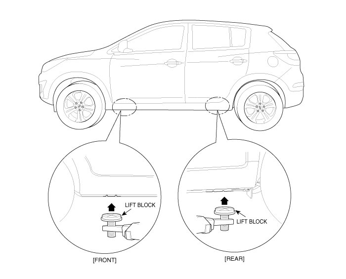 When heavy rear components such as suspension, fuel tank, spare tire, tailgate and trunk lid are to be removed, place additional weight in the luggage area before hoisting. When substantial weight is removed from the rear of the vehicle, the center of gravity may change and can cause the vehicle to tip forward on the hoist.