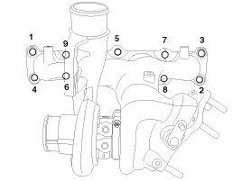 When installing the turbo manifold module , tighten the nuts with pre-torque first, and then tighten the nuts with specified torque in the sequence shown.