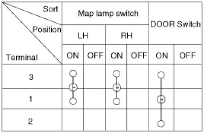 Remove the overhead console lamp assembly then check for continuity between terminals. If the continuity is not as specified, replace the map lamp switch.