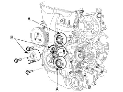 9. Remove the idler (A) and drive belt tensioner (B).
