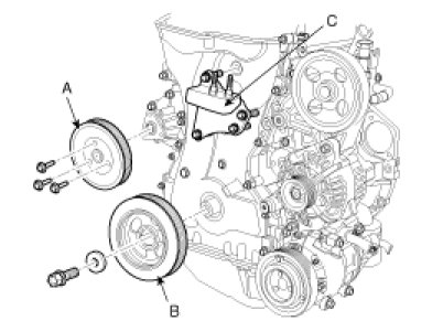 10. Remove the water pump pulley (A), crankshaft pulley (B) and engine support bracket (C).
