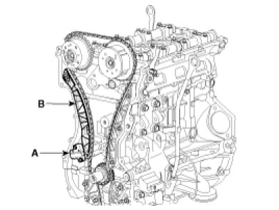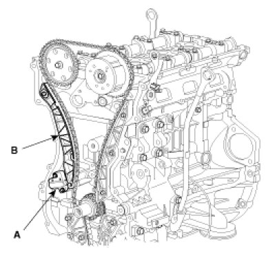 19. Remove the timing chain tensioner (A) and timing chain tensioner arm (B).