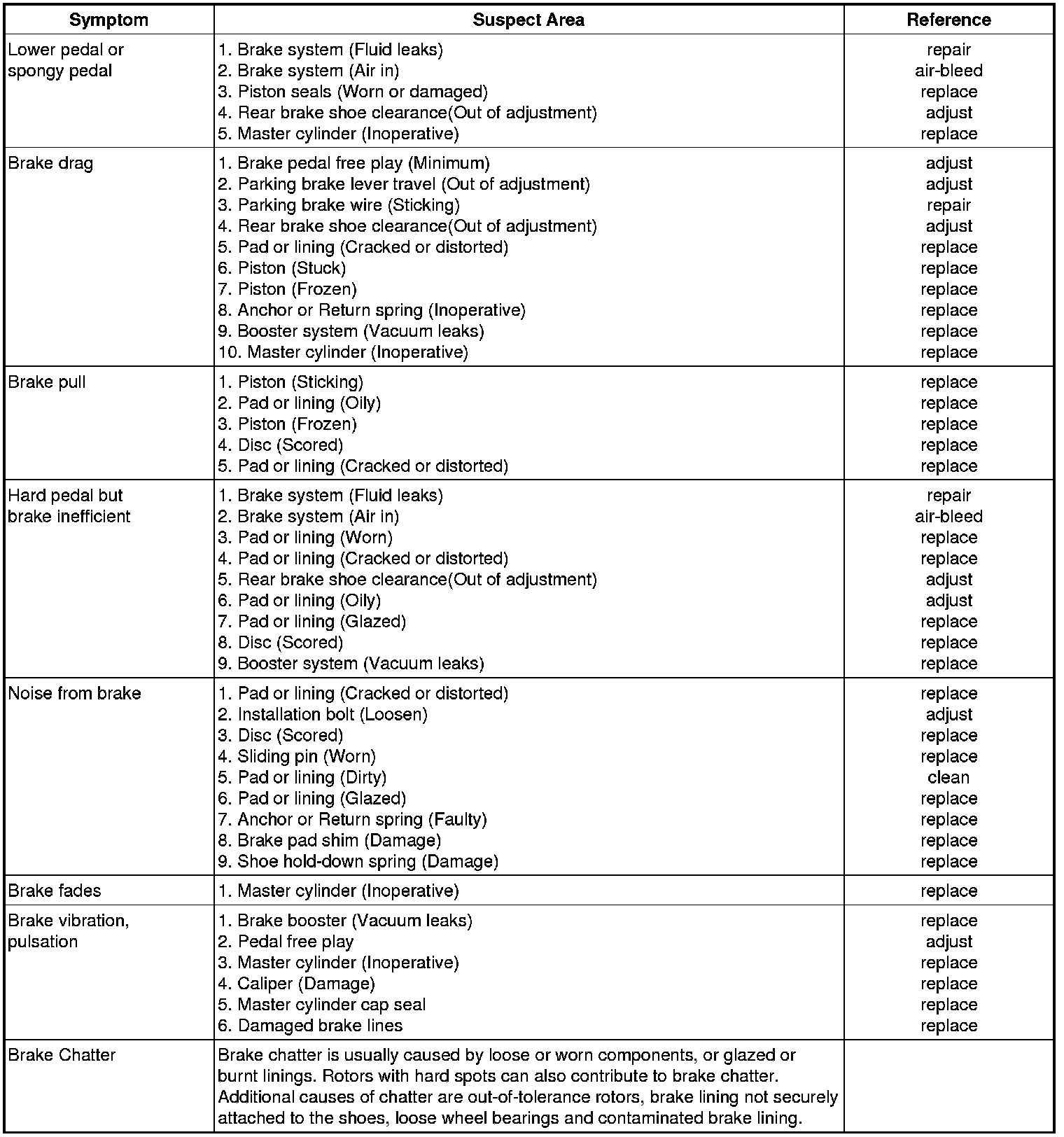 Problem Symptoms Table