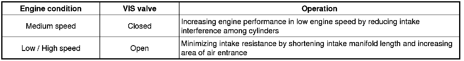 Variable Intake manifold Solenoid (VIS) valve is installed on the intake manifold. The VIS valve controls the vacuum modulator which activates a valve in the intake manifold. The ECM opens or closes this valve according to engine condition .