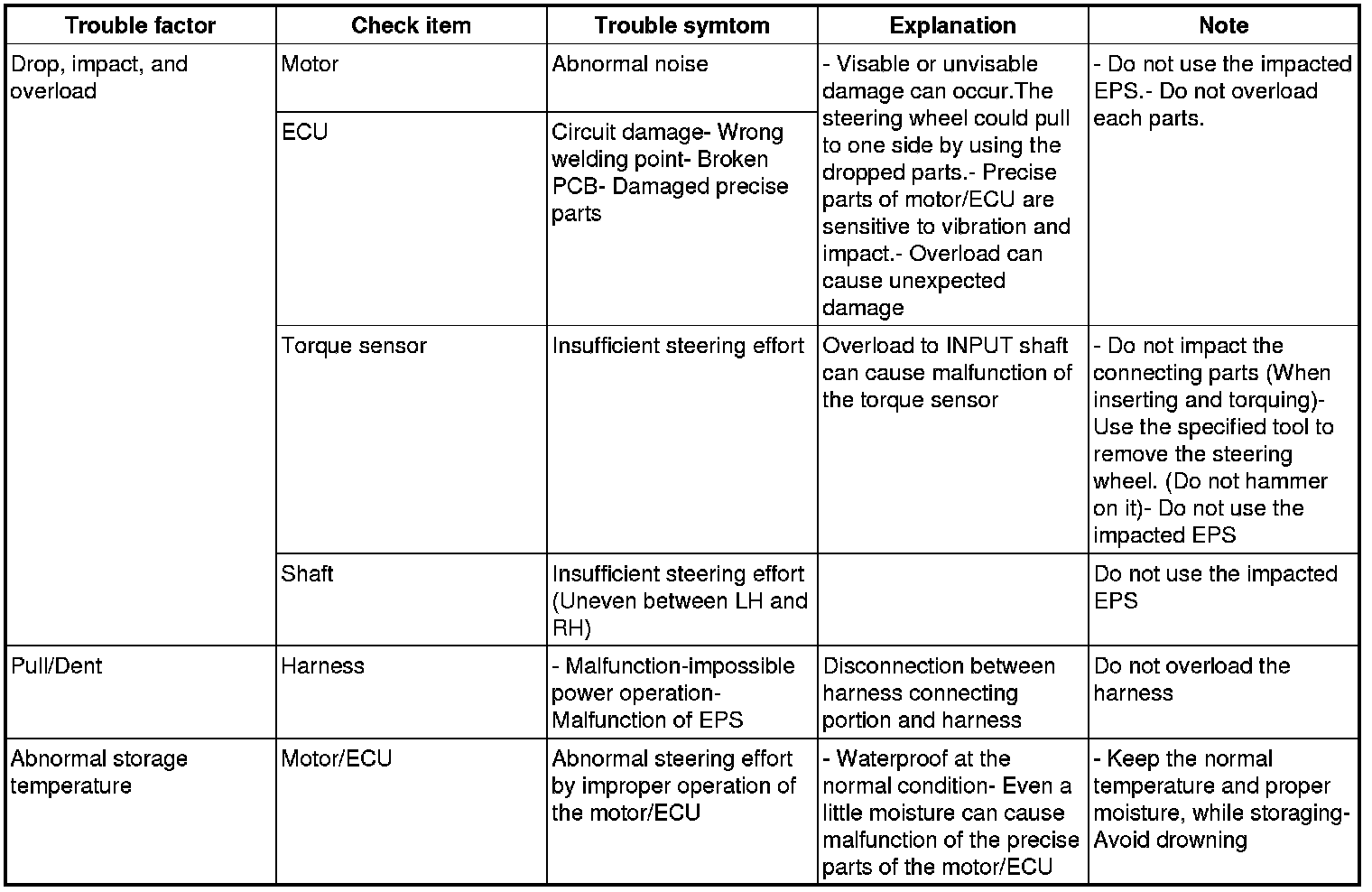 resulting in a more precise and timely control of steering assist than conventional engine-driven hydraulic systems. Components (Steering Angle Sensor, Torque Sensor, Fail-safe relay, etc.) of the EPS system are located inside the steering column. EPS unit assembly, steering column, and EPS unit assembly must not be disassembled for inspection. They must be replaced if necessary.