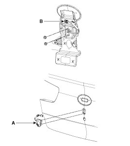 2. Remove the trunk garnish (A) after disconnecting the connector(B) and removing the nuts.