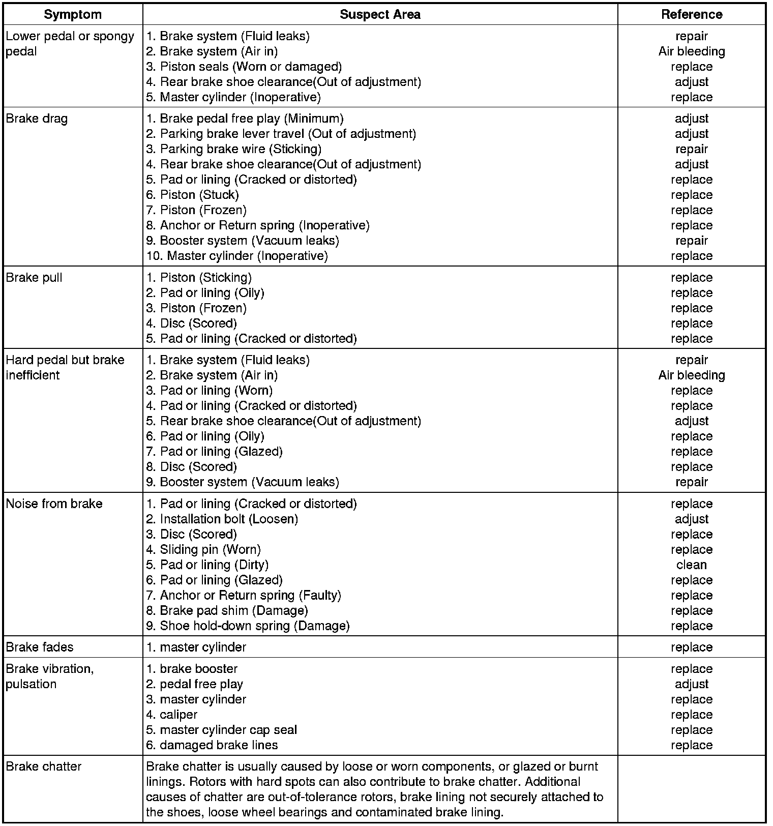 Problem Symptoms Table