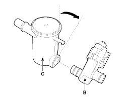 8. Remove the canister close valve (B) from the fuel tank air filter (C) after rotating it in the direction of the arrow in the figure.