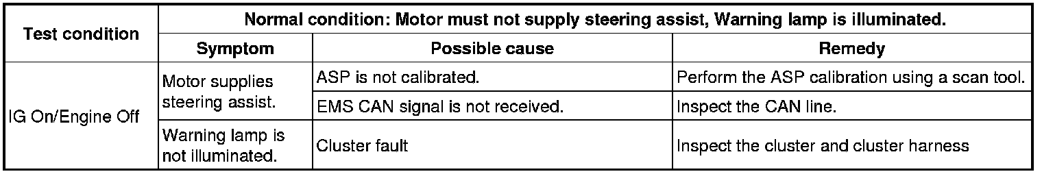 After or before servicing the EPS (Electronic Power Steering) system, perform the troubleshooting and test procedure as follows. Compare the system condition with normal condition in the table below and if abnormal symptom is detected, perform necessary remedy and inspection.