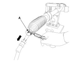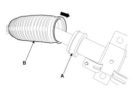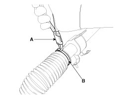4. After making the space to the bellows and tie-rod end contact part by using the (-) driver, remove the bellows (A) in the direction of the arrow.(The left and right same work)
