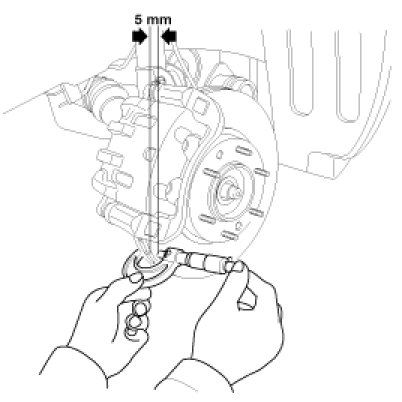1. Place a dial gauge about 5mm (0.2 in.) from the outer circumference of the brake disc, and measure the run out of the disc.