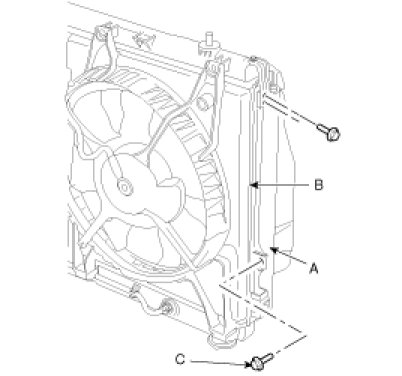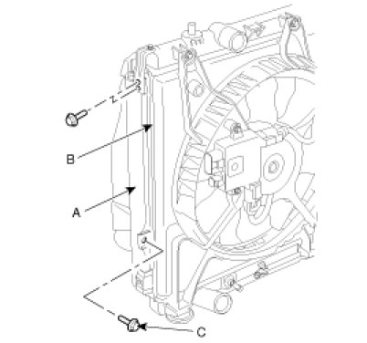 13. Separate the condenser (A) from the radiator assembly (B) by removing the bolts (C).
