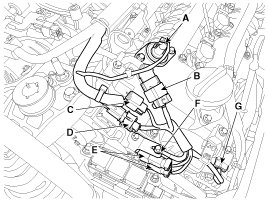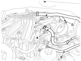7. Disconnect the PCSV hose (A), fuel hose (B), brake booster vacuum hose (C), PCV hose (D).
