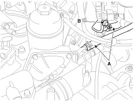 (2) RH front, rear oxygen sensor connector (A) and loosen the power steering hose mounting bolts (B).