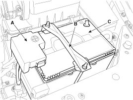 5. Disconnect the battery positive terminal (A) and then remove the battery clamp (B), battery (C).