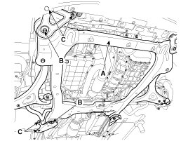 (4) Remove the FAM mounting bolts (A) and take the FAM (B) out of the splash shield (C).