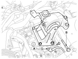 27. Disconnect the ground cable (A), and then remove the transaxle mounting bracket through bolt (B).
