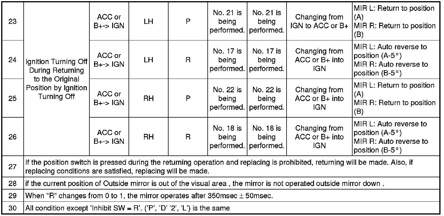 1. In IGN On (IGN State = On) or Driver door opened or during 30 seconds after Driver door open to close when IGN Off Condition (It used IMS Main signal), if user press the position button, Outside Mirror is play to memorized position