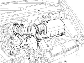 (2) Disconnect the air intake hose and then remove the air cleaner assembly (C).
