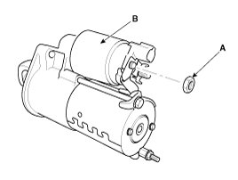 1. Disconnect the M-terminal (A) on the starter solenoid assembly (B).