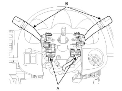 8. Disconnect the connectors (A) and remove the multifunction switch (B).