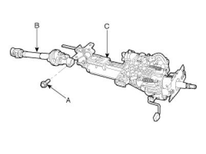 1. Remove the universal joint (B) assembly from the steering column assembly (C) by loosening the bolt (A).