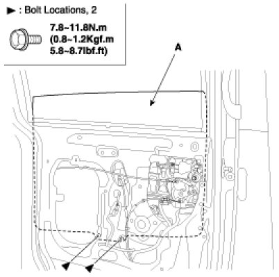 2. Carefully move the glass (A) until you can see the bolts, then loosen them. Separate the glass run from the door panel and carefully pull the glass out through the window slot.