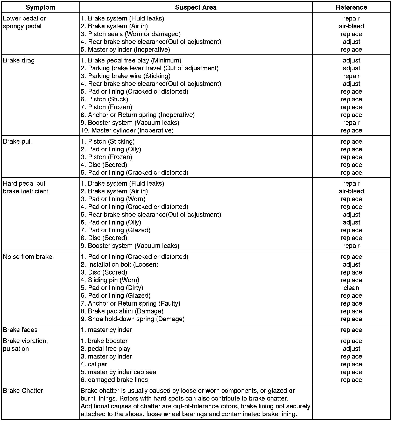 Problem Symptoms Table