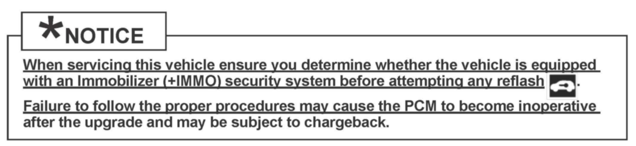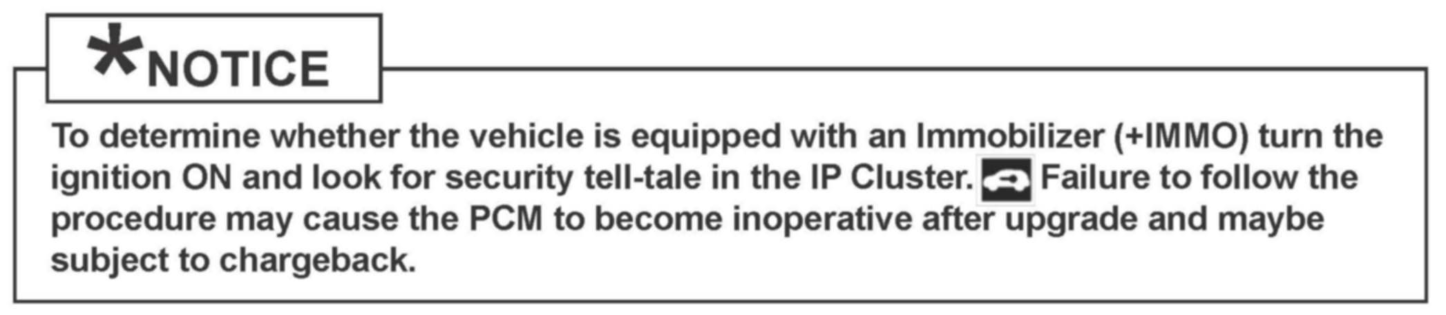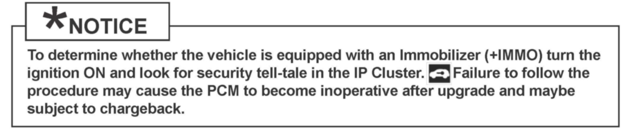 To determine whether the vehicle is equipped with an immobilizer (+IMMO) turn the ignition ON and look for security tell-tale in the IP Cluster. Failure to follow the procedure may cause the PCM to become inoperative after upgrade and may be subject to chargeback.