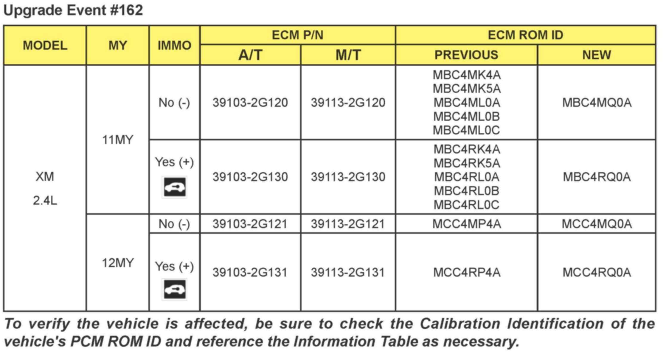 This bulletin provides the procedure to upgrade the Powertrain Control Module (PCM) of some 201112MY Sorento (XM) vehicles equipped with 2.4L engine produced from October 1, 2010 to June 3, 2011. Some vehicles may experience a Malfunction Indicator Lamp (MIL) illuminated with system related DTC P200A stored in the PCM. To ensure maximum customer satisfaction Kia is requesting the completion of this Service Action on all affected 201112MY vehicles. For confirmation that the latest reflash has been performed on a vehicle you are working on verify ROM ID using the tables in this TSB.
