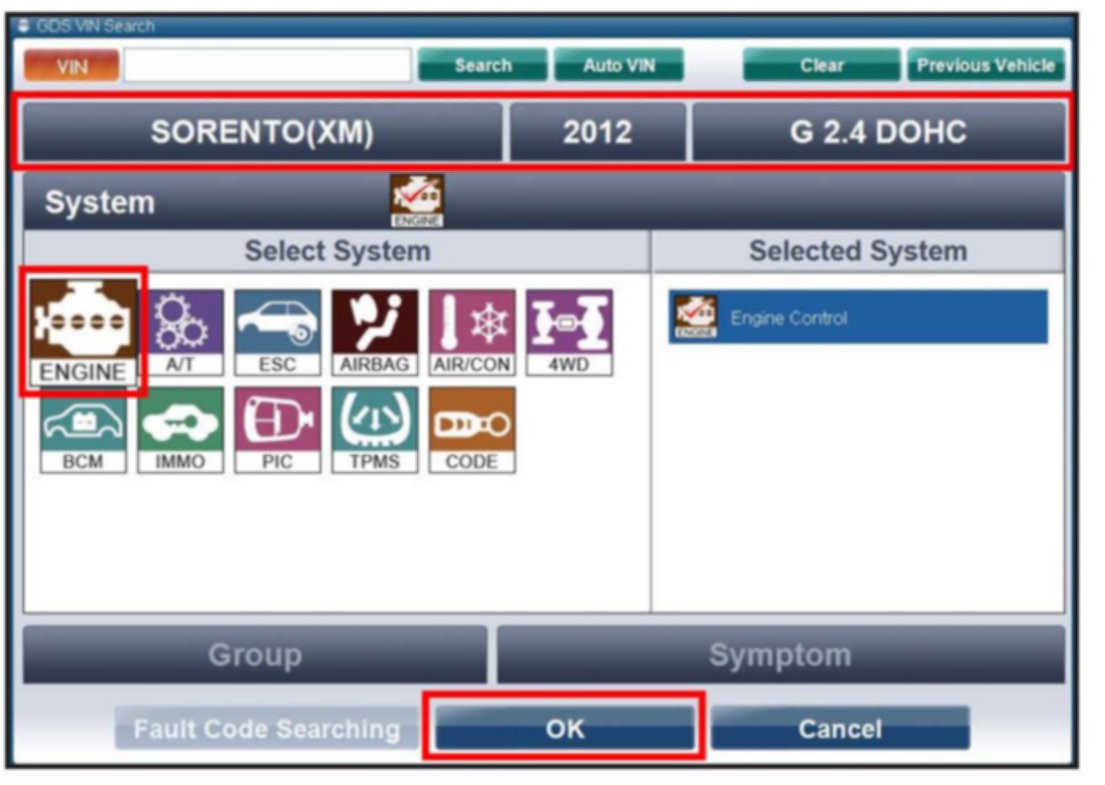 5. With the ignition key ON (DO NOT start the engine!), turn ON the VCI and GDS tool. Access the GDS vehicle identification number (VIN) screen and configure the vehicle using the VIN AUTO DETECT Function.