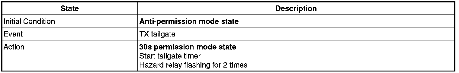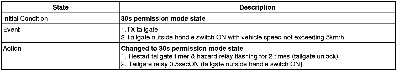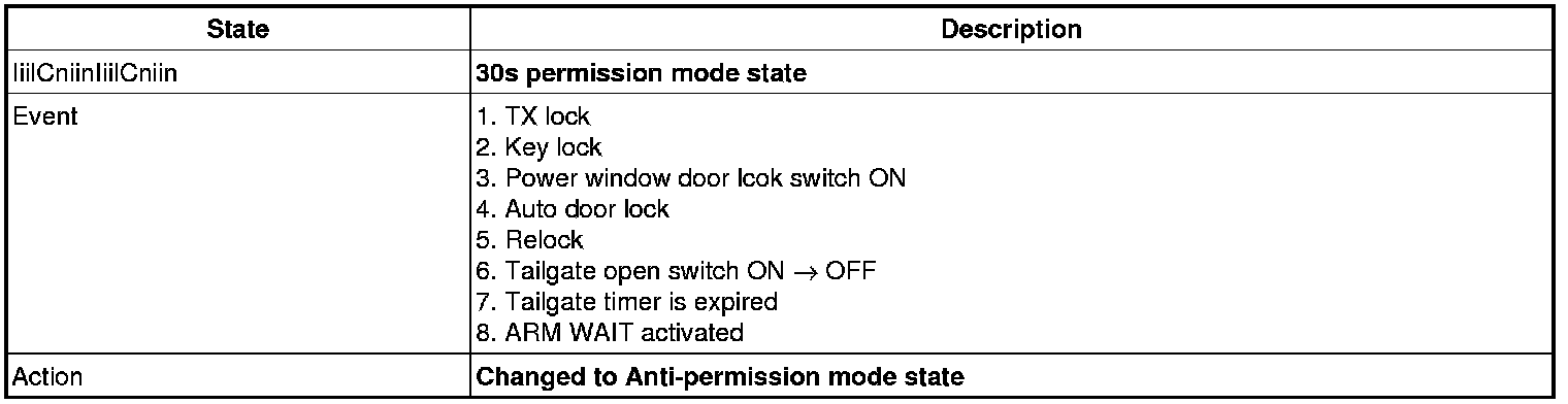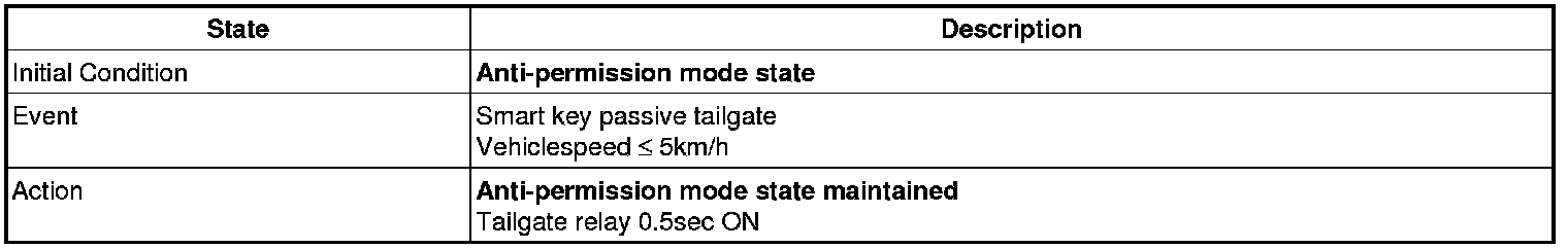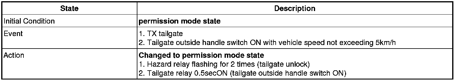 (2) Door Lock Output is operated when Inhibit P signal Input value is changed from 1 -> 0 with All door close (including Tail Gate) and Any door unlock after 300msec from IGN1 is ON and Alt L is ON. However, the output is not operated with All door Lock or All door fail.