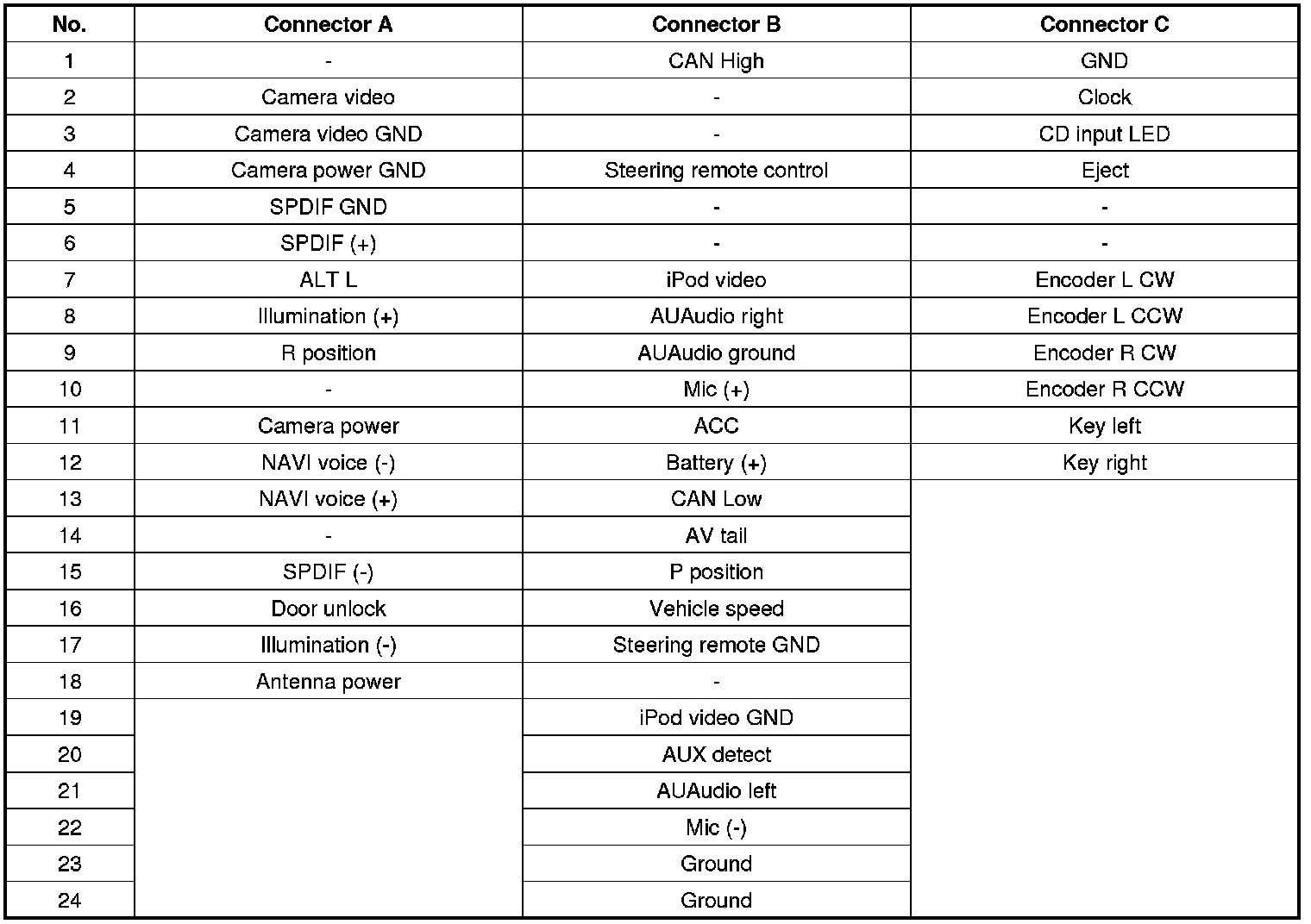 ComponentsAVN (A/V & Navigation) Head UnitConnector Pin Information