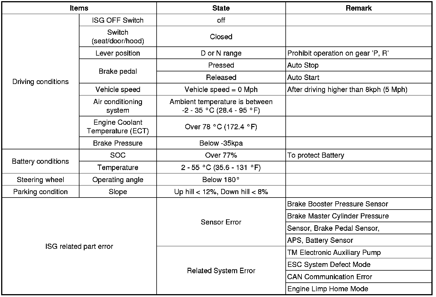 When the ISG related sensors or system error occurs, the ISG OFF switch lights up. Especially when the battery sensor is replaced or reinstalled, the vehicle must be placed in the ignition switch OFF for about 4 hours for recalibration.
