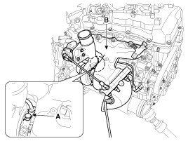 Disconnect the oil feed pipe (A) and then remove the turbo manifold module (B).