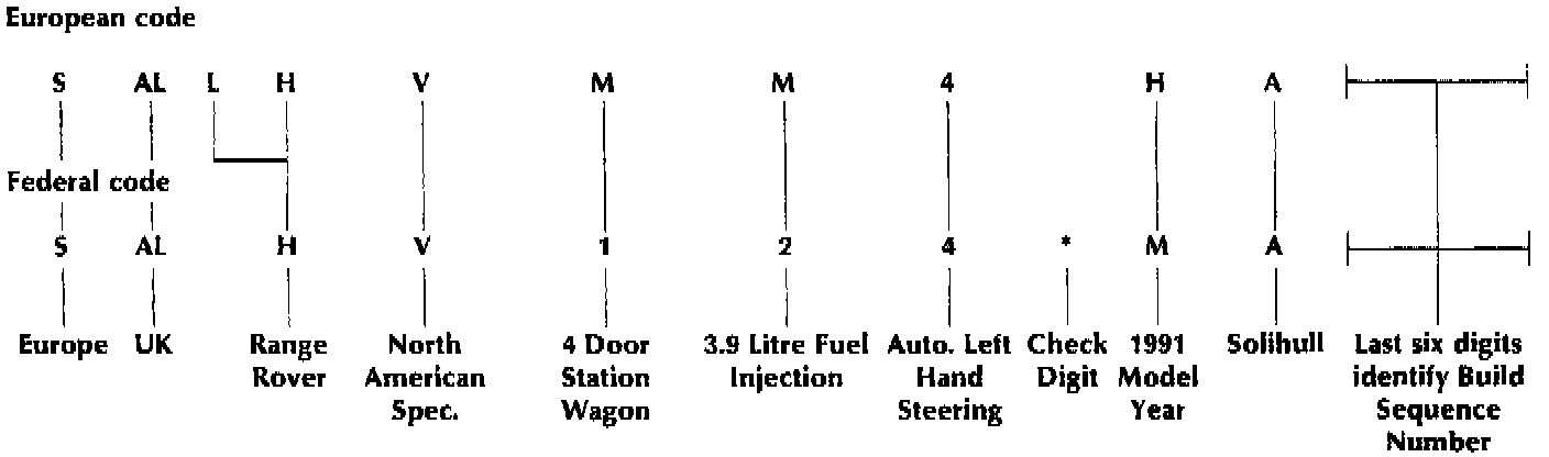 The Federal Vehicle Identification Number consists of similar information to the European number and is made up of a minimum of 17 digits. These numbers are used, to identify manufacturer, model range, specification, body type, engine, transmission/steering, model year, plant and build sequence number and serve to identify the vehicle.